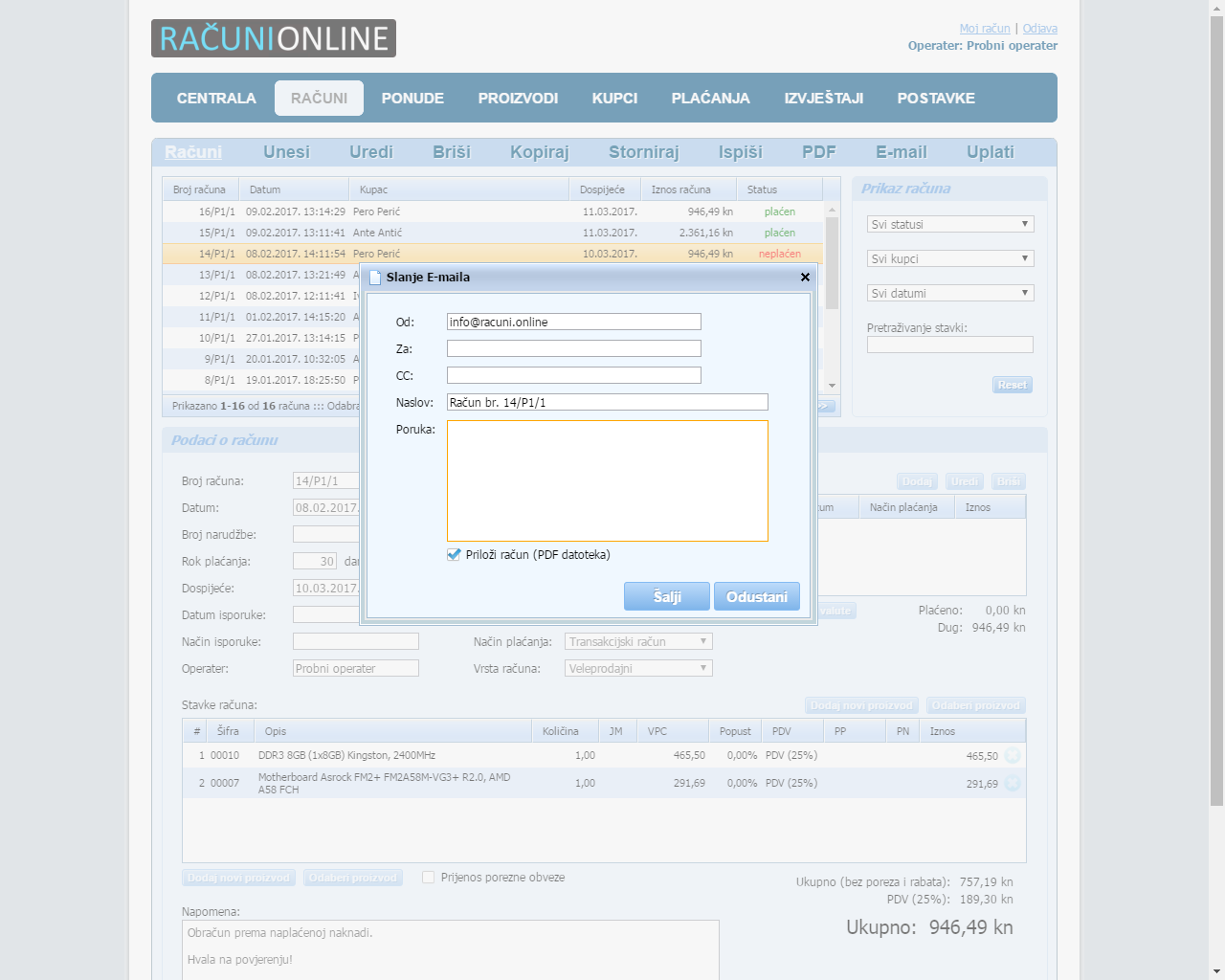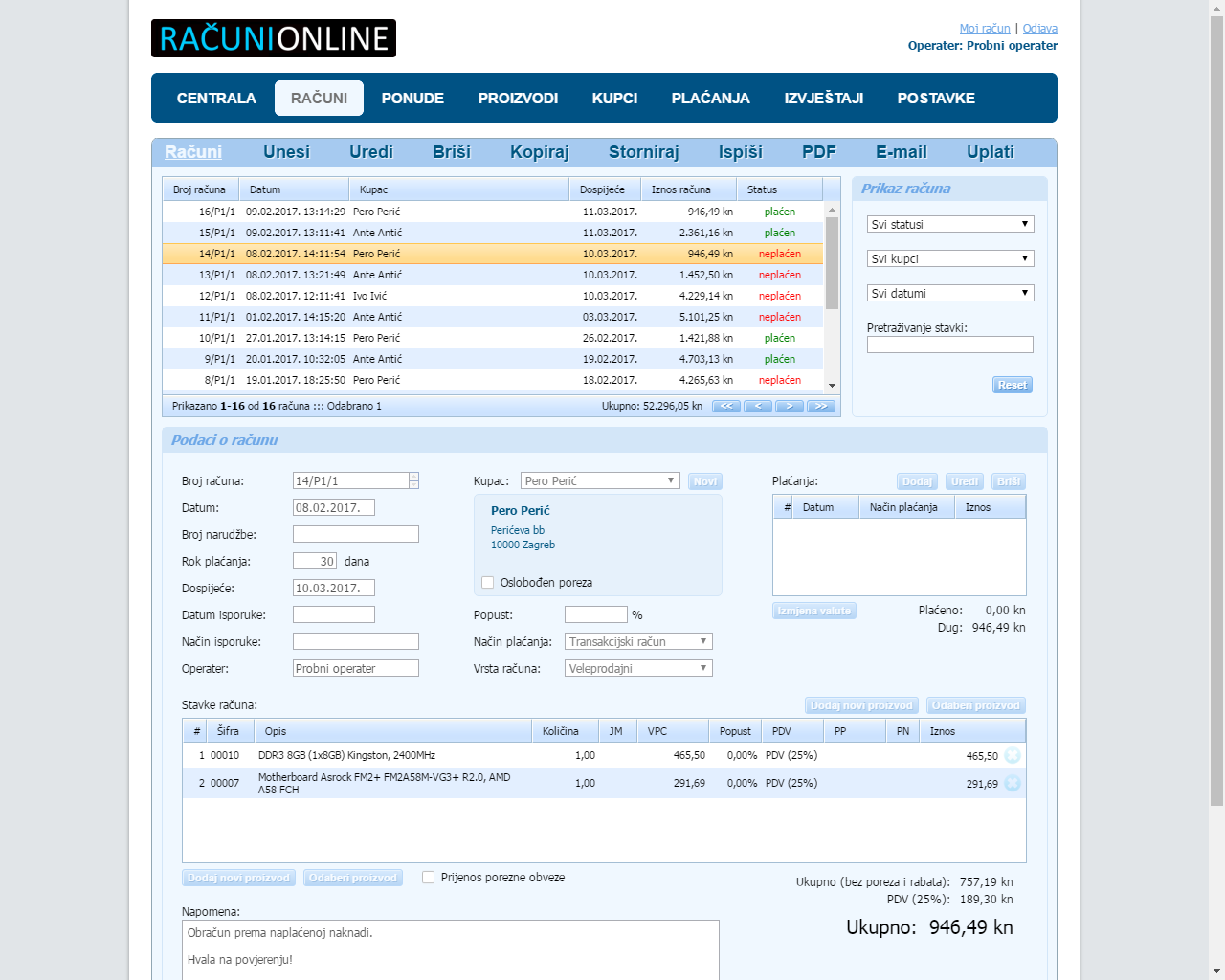 U tablici možete pretraživati i sortirati račune, te ih filtrirati prema statusu, vremenskom razdoblju i kupcu. Možete ih uređivati, brisati, stornirati, kopirati, ispisivati, preuzimati i dostavljati u PDF formatu, dodavati uplate itd.