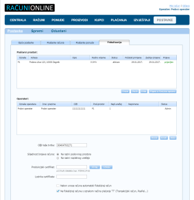 Ovdje se nalazi baza Vaših poslovnih prostora i operatera, te sve postavke vezane za fiskalizaciju: OIB tvrtke, slijednost brojeva računa, certifikat za fiskalizaciju, lozinka certifikata itd.